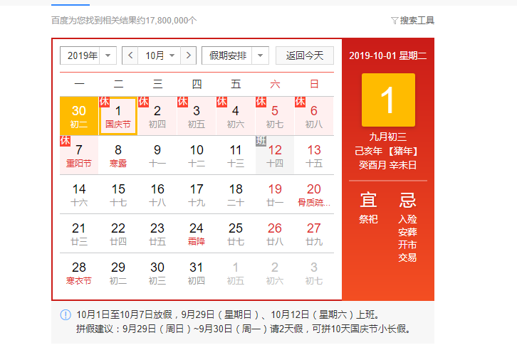 2019年10月1日(周二)至2019年10月7日(周一)為國家法定假日,放假7天。10月8日(周二)正常上班!