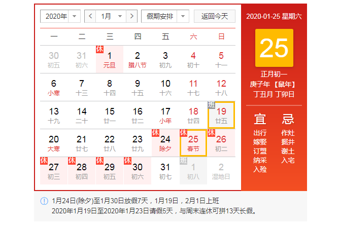 2020年1月24日(周五)至2020年1月30日(周四)為國家法定假日,放假7天。1月31日(周五)正常上班!
